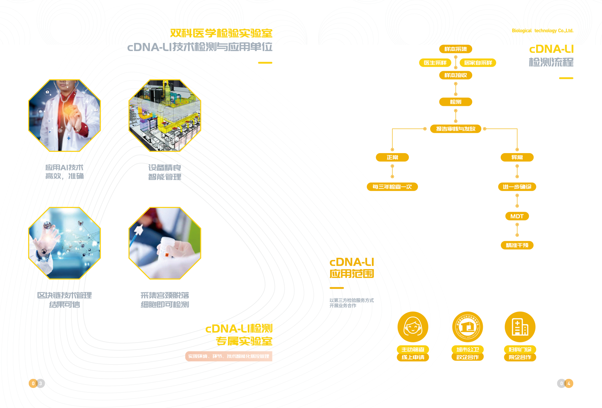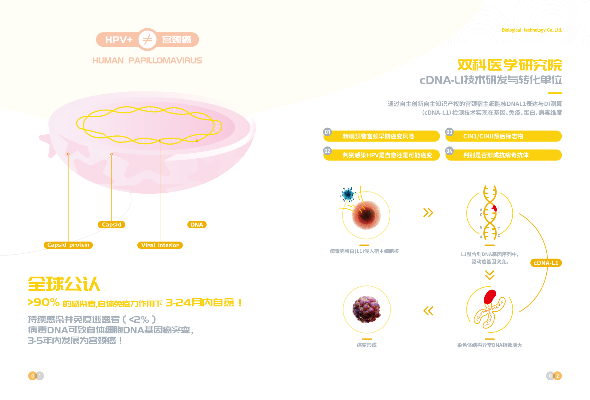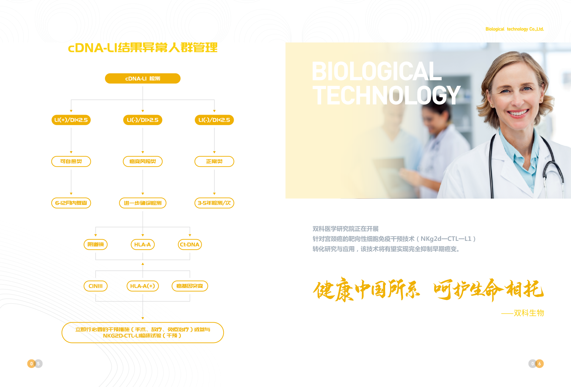 深圳市雙科生物科技有限公司創立于2012年12月12日,是按照國家“十二五”、“十三五”科技創新規劃、《中國防治慢性病中長期規劃(2017-2025年)》與《“健康中國2030”規劃綱要》等政策要求,以“健康中國所系,呵護生命相托”為公司使命,在“十二五”及“十三五”期間公司先后完成技術體系建模與試運行、服務體系構建與運行、腫瘤綜合防控體系建立與實施,在高新生物技術領域,形成了具有完全自主創新與獨立知識產權的常見腫瘤液態活檢技術、體細胞技術、醫學AI技術、宮頸癌預警cDNA-L1技術、腦卒中早期預警MTHFR/MTRR技術 、 N-MDT技術、“防-控`-?!奔夹g等和服務體系。